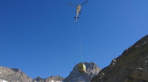 Hélicoptère transportant un module de chantier en montagne pour une installation en zone d'accès difficile.