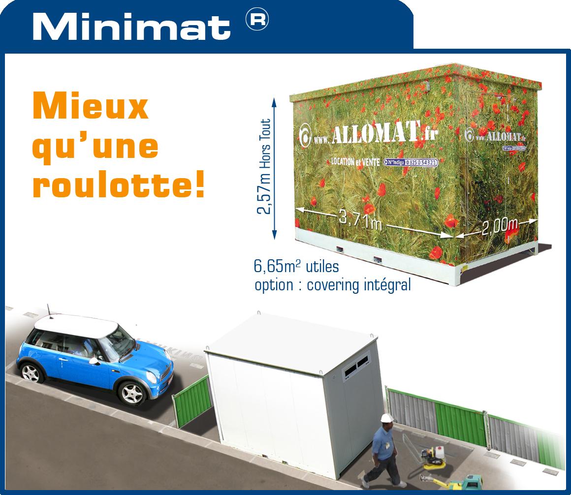 Publicité Allomat/Minimat pour un module de chantier compact (6,65m²), comparé à une voiture.