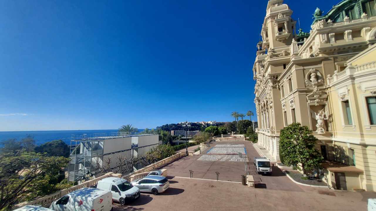 Vue panoramique du Casino de Monte-Carlo et des modules de vestiaire chantier en arrière-plan.